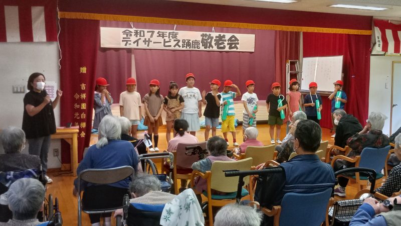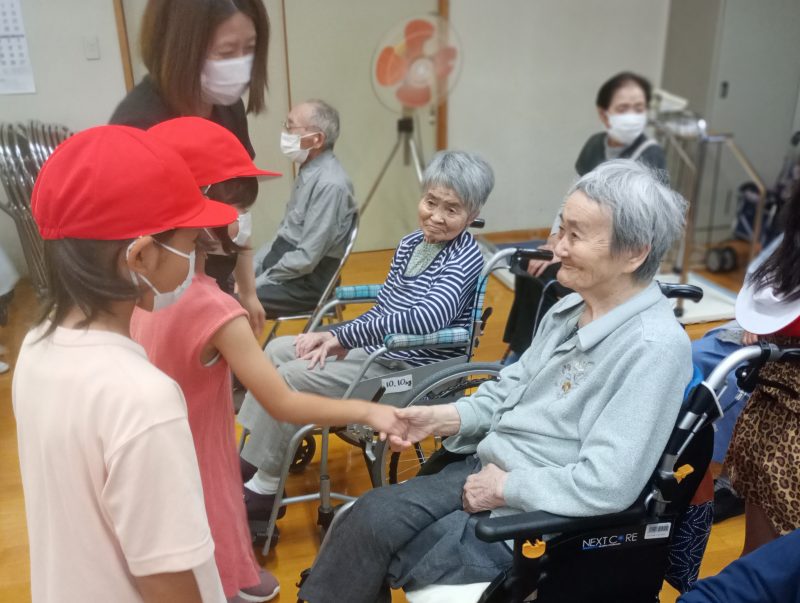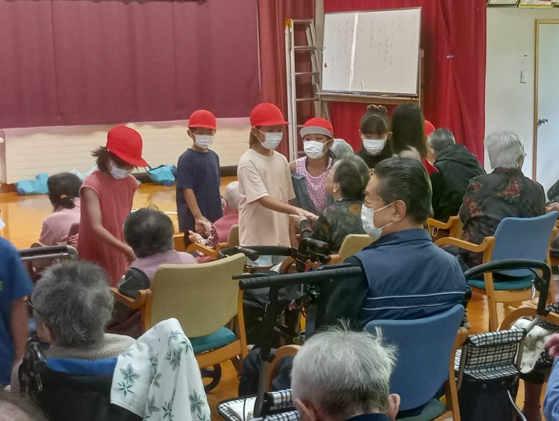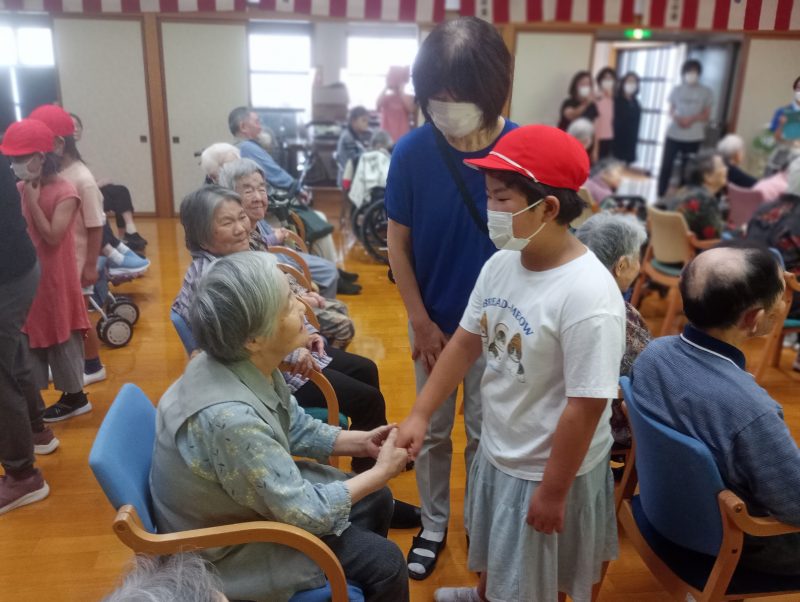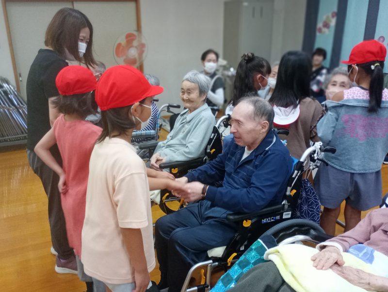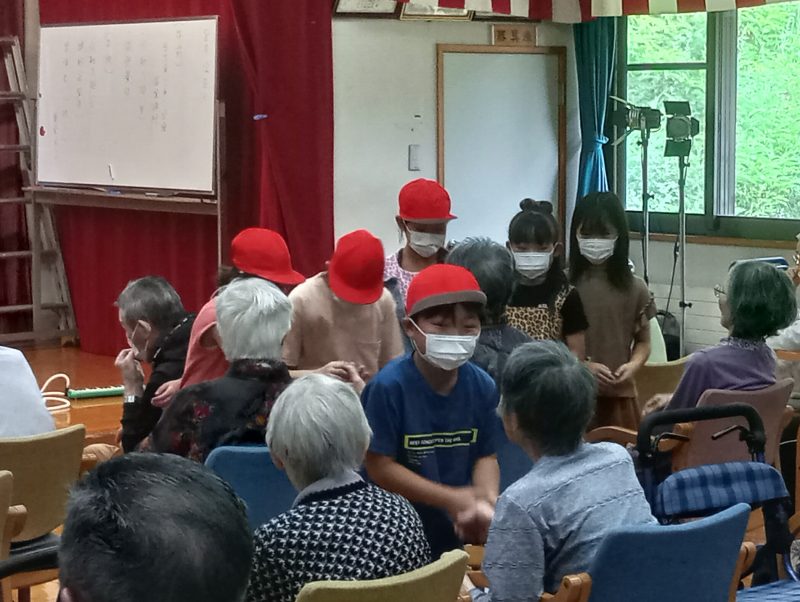 6年ぶりに青笹小との交流会開催(森) 9月16日 青笹小学校と定期的な交流を続けている吉祥園ですが、令和2年からは新型コロナの影響で子供たちに施設に来て頂くことが難しい状況でした。そろそろ施設の活動も以前の状況に近づけたいと考えていたところ、小学校側から施設と交流をしたいとの話を頂き、9月16日、2年生の皆さんが施設にやって来ました。 歌やメロディオンの演奏を聞かせて頂いた後、利用者の皆さんと握手でごあいさつ。利用者の皆さんにとってはこれが一番うれしいようでした。