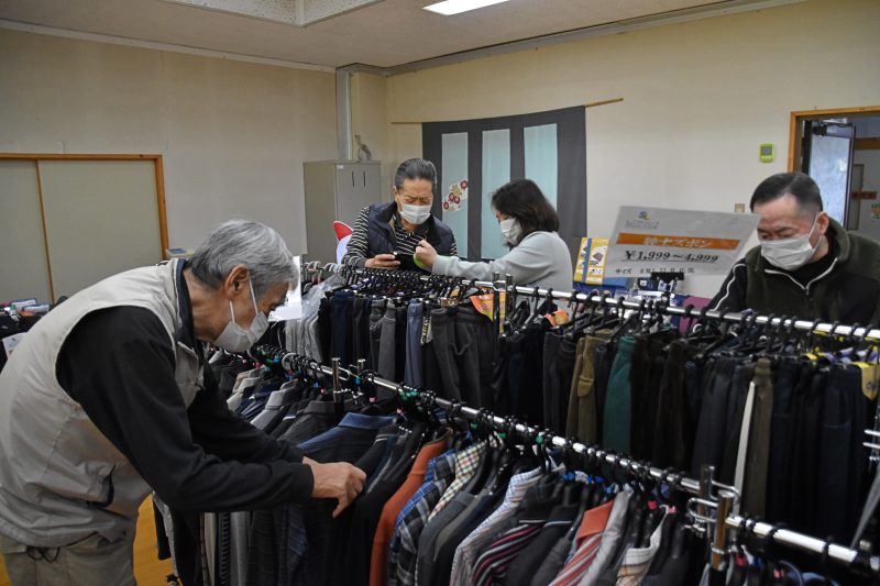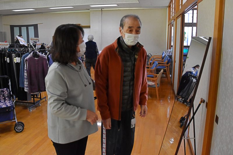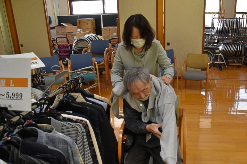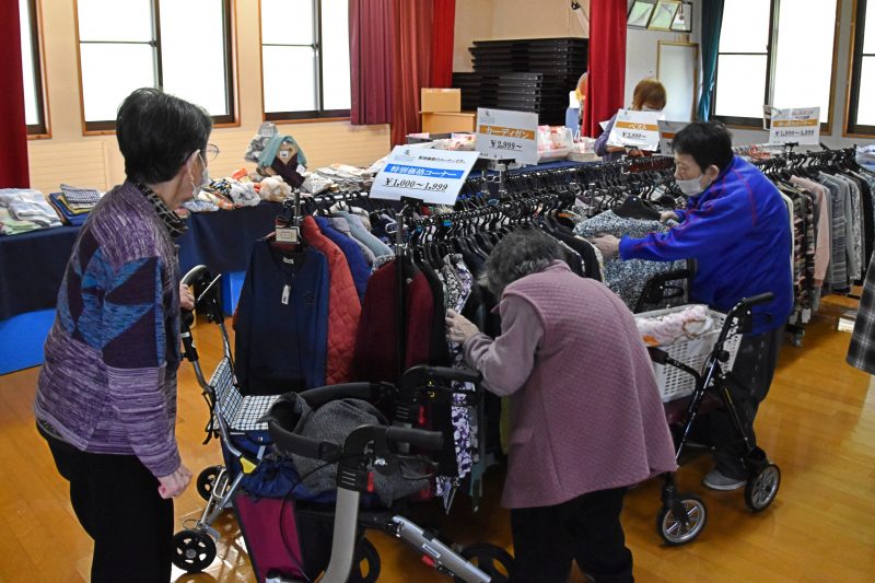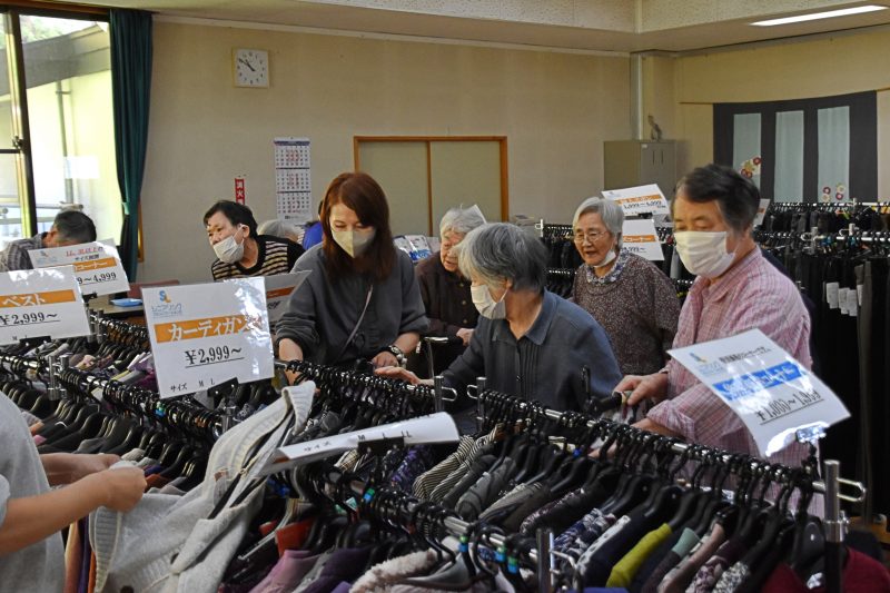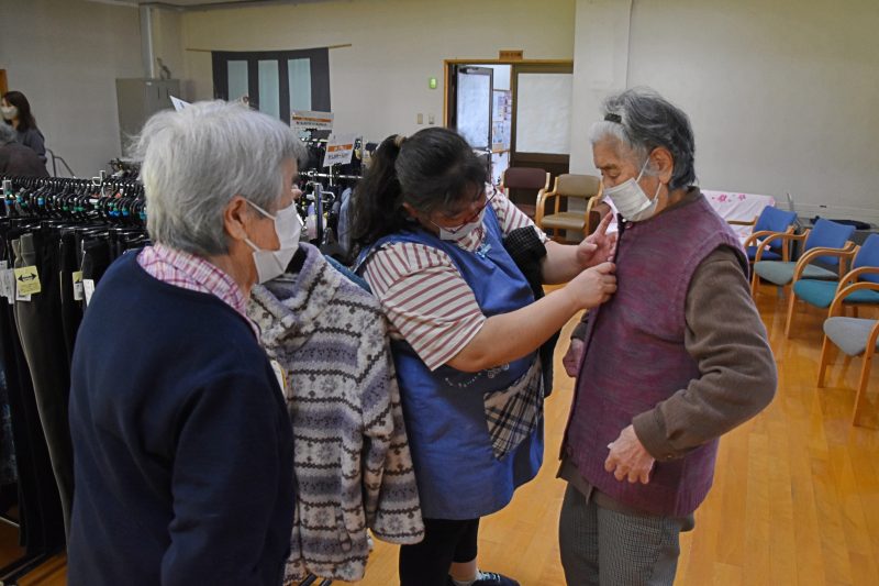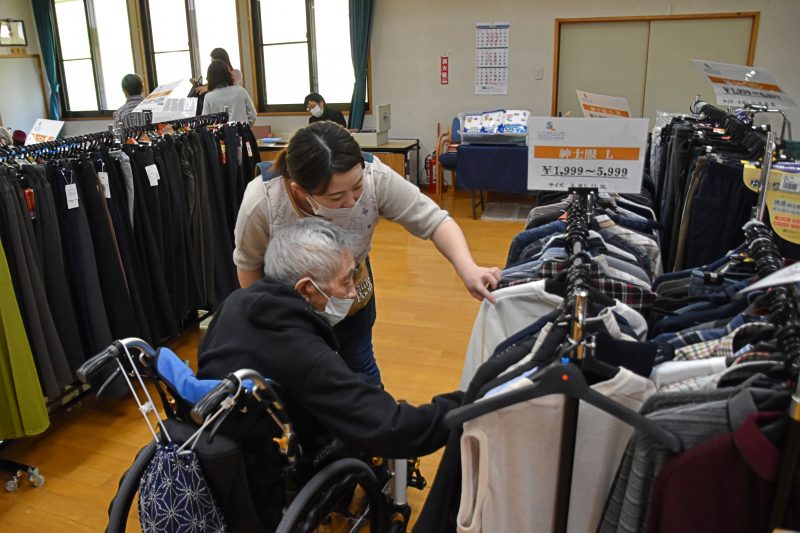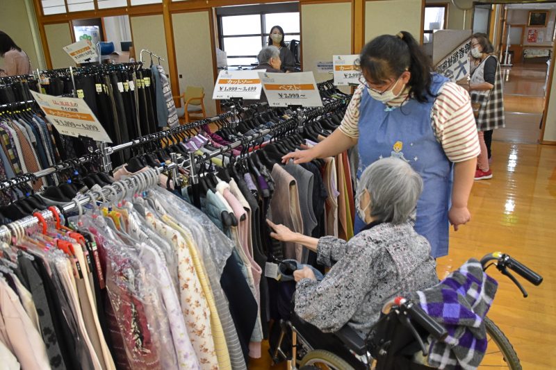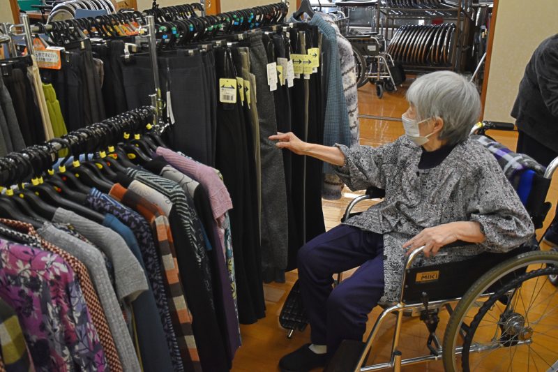 10月17日、福島県福島市から衣類の訪問販売をしている「シニアリンク デパート」さんに来て頂きました。こちらは施設からの依頼で訪問してくれるショップで、高齢者向けファッションに特化しています。商品を直接手に取り、自分に似合うかどうか合わせることもできるので、利用者の皆さんはじっくりと商品を品定めすることができます。