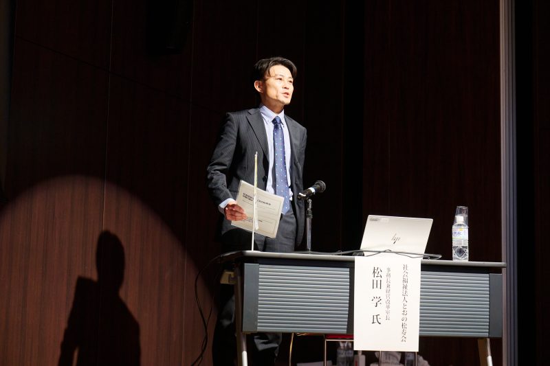その後、受賞した企業の事例紹介として、経営改革室長兼事務長の松田が取り組み事例を紹介。